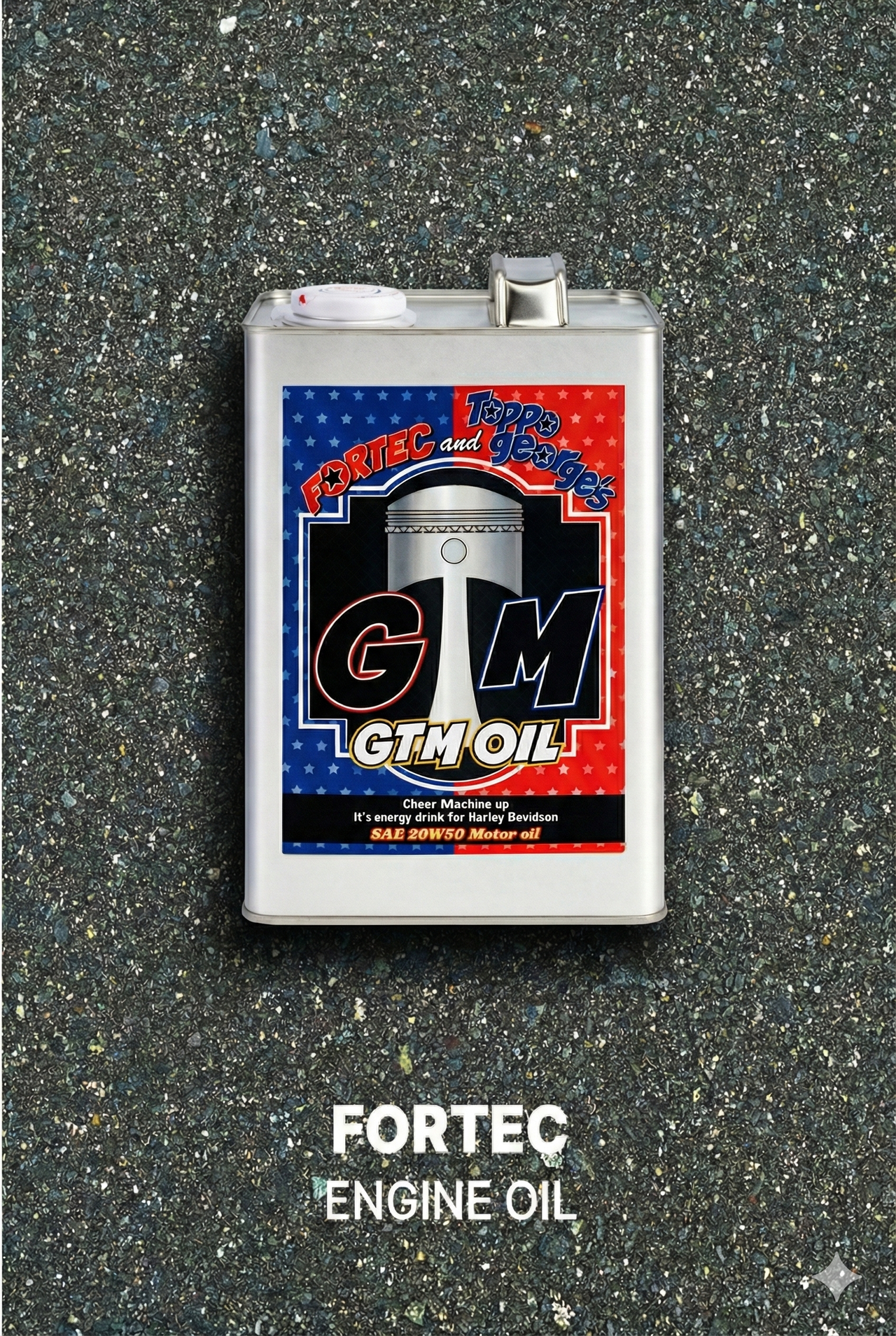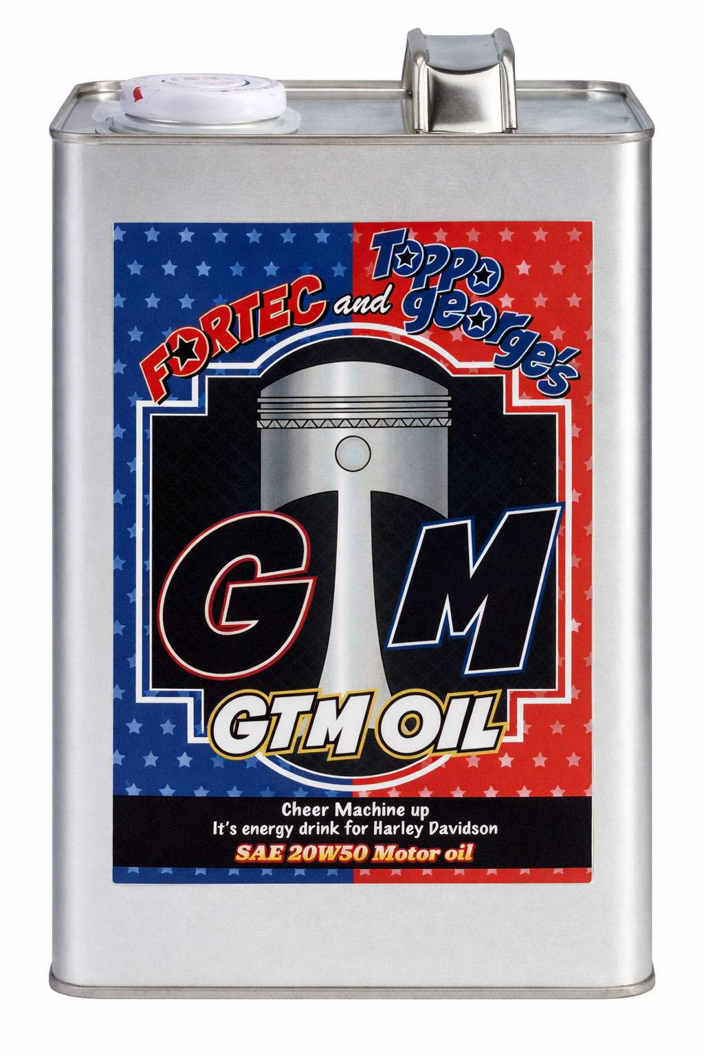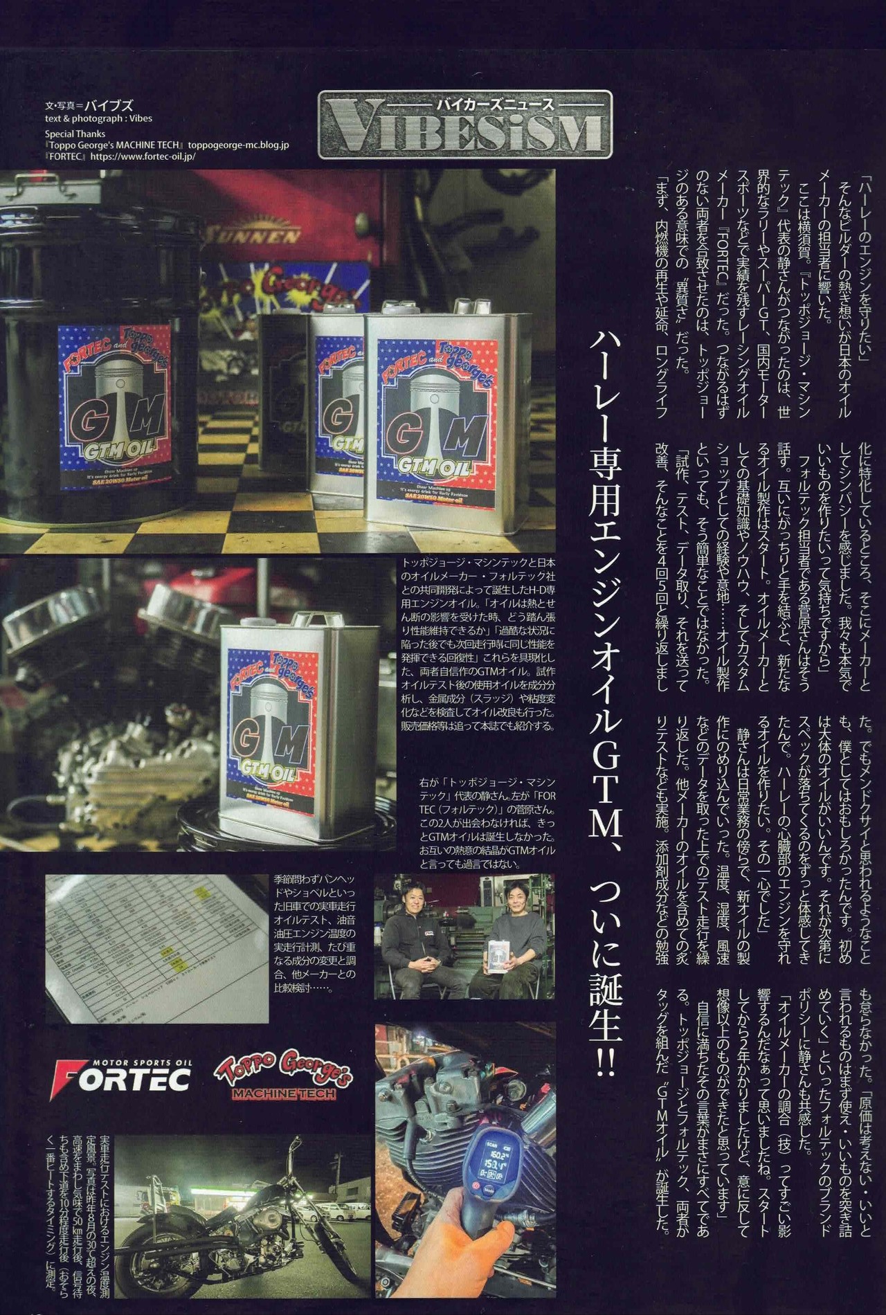 중앙 (오일 캔 사진) 토포 조지 머신 테크와 일본의 오일 메이커 포르텍의 공동 개발로 탄생한 H-D(할리데이비슨) 전용 엔진 오일. "오일은 열과 전단(Shear)의 영향을 받았을 때, 얼마나 끈질기게 점도 특성을 유지할 수 있는가", "가혹한 상황에 처한 뒤에도 다시 원래 성능을 발휘할 수 있는 회복성", 이들을 구현해 냈다. 양측의 자신작인 GTM 오일. 시제품 오일 테스트 후 사용유 성분 분석, 금속 성분(슬러지)이나 점도 변화 등을 검사하여 오일 개량을 진행했다. 판매 가격 등은 본지에서도 소개한다.